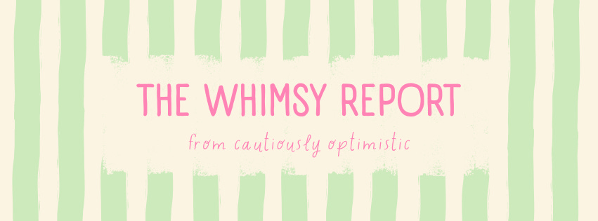 It’s hard to believe, but we’re already in mid-March. I’m sure you’ve heard the reports that the last time we were in this energy1, the world shut down. In an effort to “rewrite the narrative”2, what was formerly known as the "weekly rundown”3 will now be the “Whimsy Report,” a monthly collection of picks, links, and pretty much anything that is bringing me or those around me joy… and maybe it will for you, too?