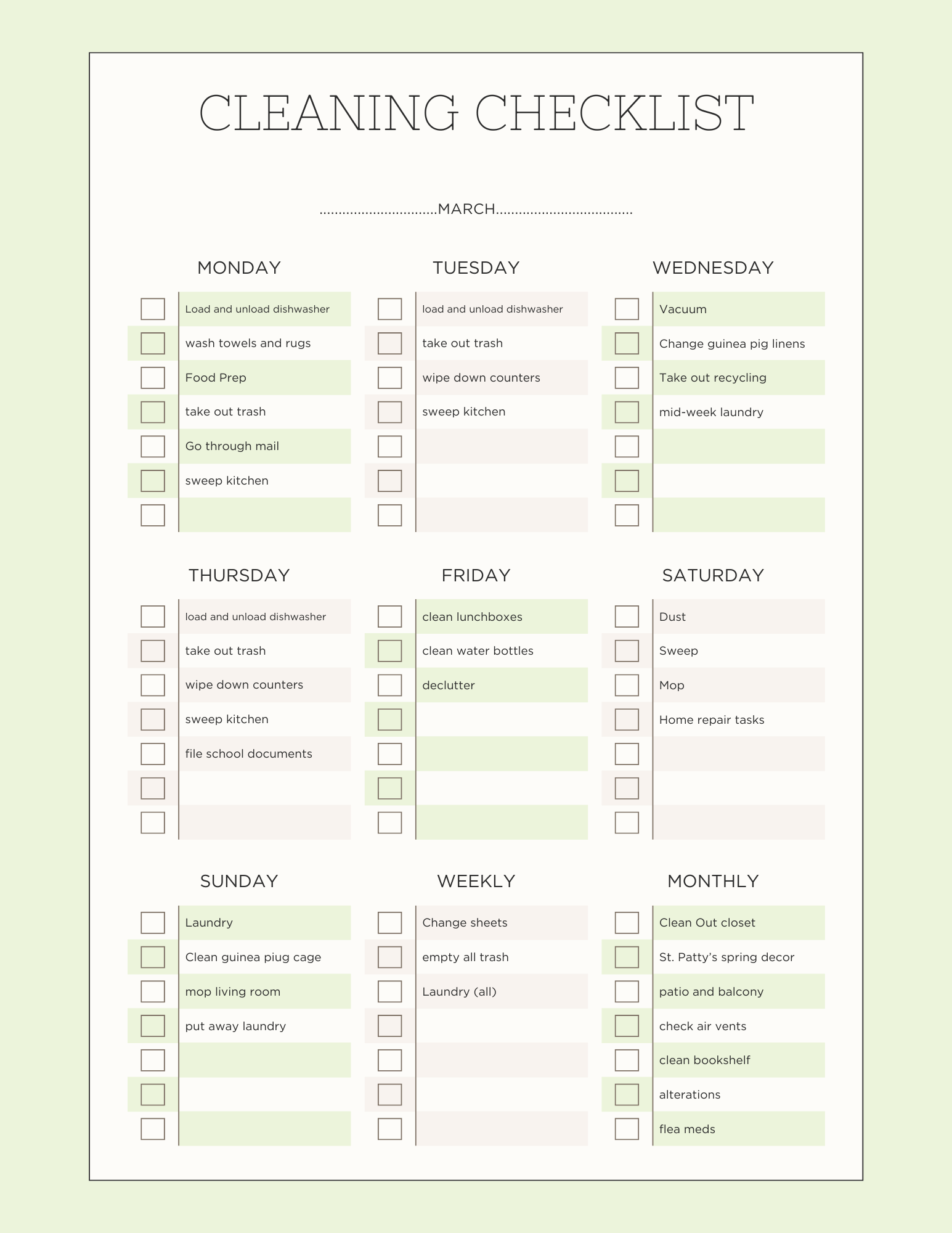 I’ve been making these kinds of checklists for myself and friends throughout the years, so in honor of “spring cleaning," here’s my ultimate cleaning checklist (featuring my March special projects… cool!)